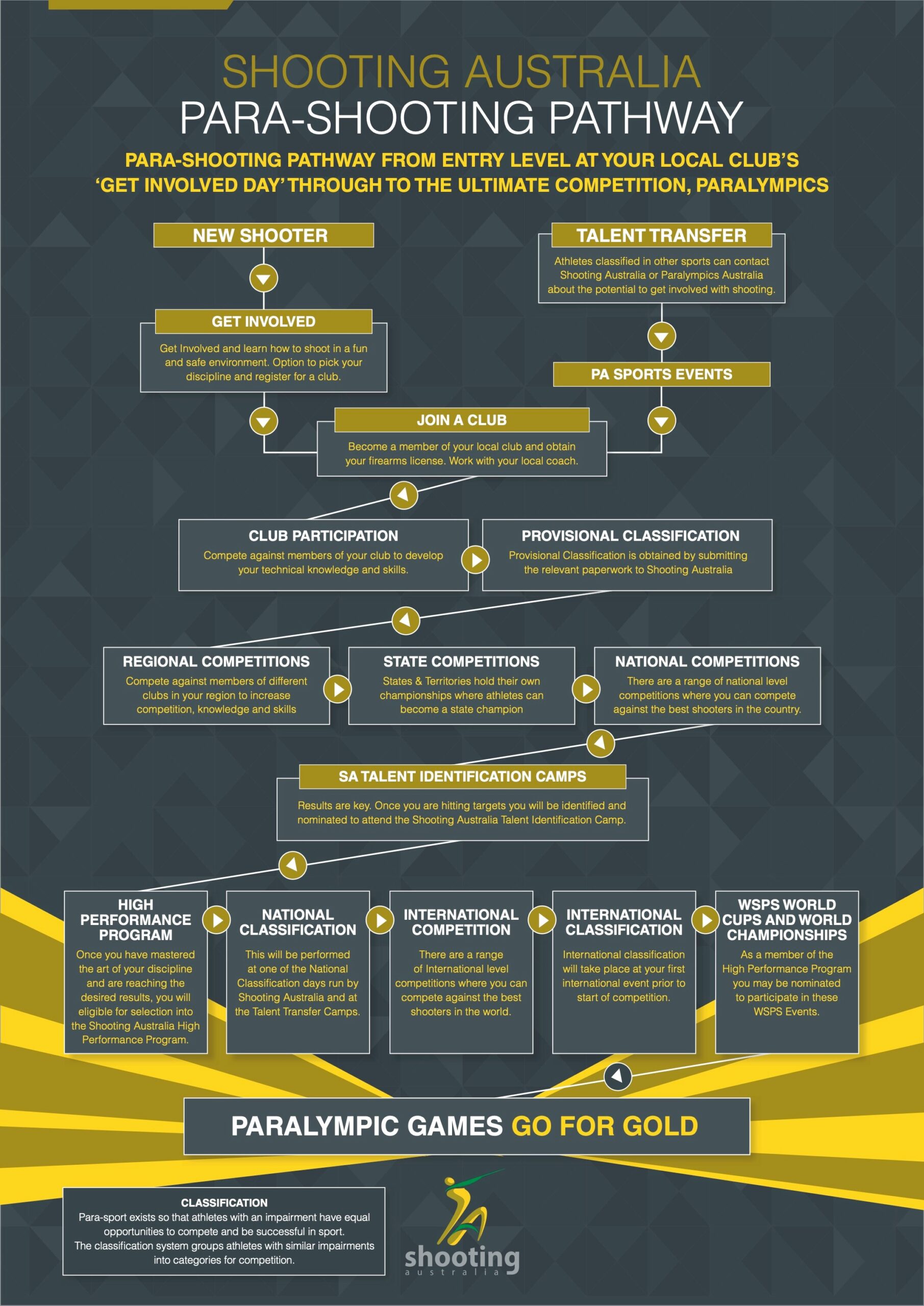 There are a range of disability groups eligible to compete within the Australian shooting system as an athlete with a disability. These disability groups are separated into varying classifications to ensure fair competition. Each disability group has a set of minimum impairment criteria that an athlete must meet in order to be eligible to compete as an athlete with a disability. Athletes must undergo specific Athlete Evaluation or Eligibility processes to obtain a classification. Please click on the link below for more information on classification.
