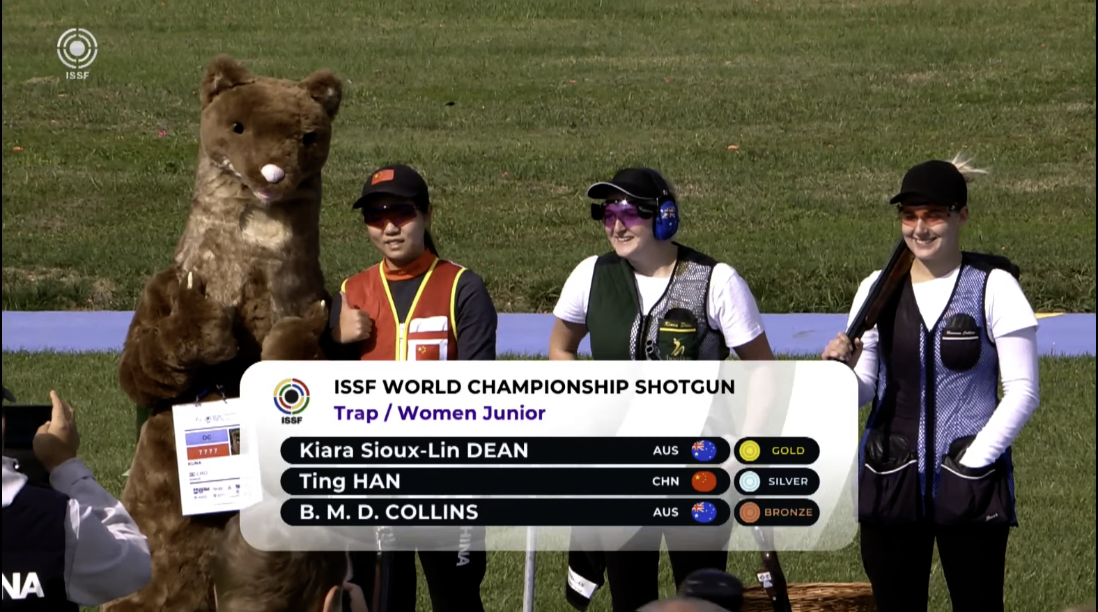 Junior Australian Trap shooters Kiara Dean and Breanna Collins claimed the gold and bronze medals respectively after a strong qualification which saw Kiara place 3rd and Breanna place 5th before going on to score 21/25 and 20/25 in the semi final respectively to qualify for the medal match. In the medal match, Breanna Collins scored 19/25 to win the bronze medal for Australia, with Kiara Dean and Ting Han of China being tied at 30/35 each entering a shoot off where Kiara came away with the gold for Australia.