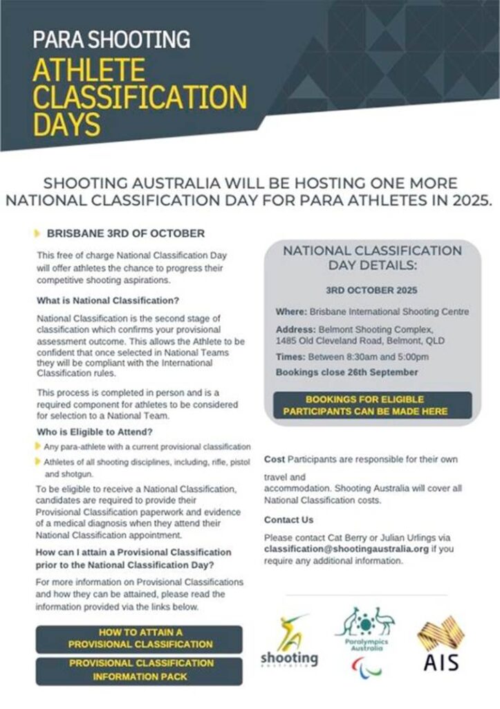For Para athletes still looking to receive a national classification, Shooting Australia will be hosting its second and final classification day of 2025 in Brisbane on the 3rd of October.