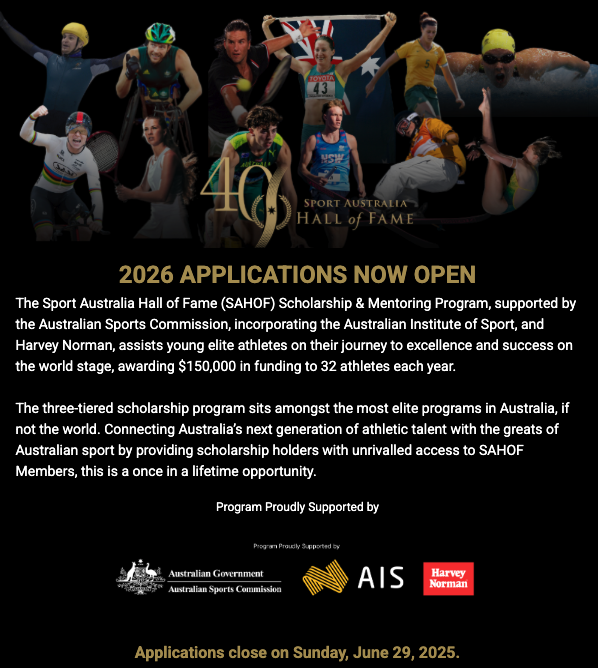 Applications for the Sport Australia Hall of Fame Scholarship & Mentoring Program are close on the 29th of June 2025.