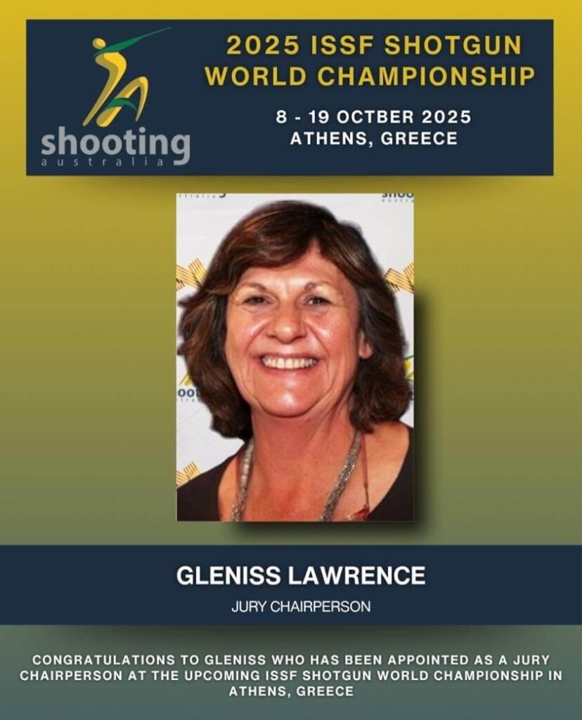 Shooting Australia congratulations Gleniss Lawrence on her appointment to the role of Jury Chairperson at the 2025 ISSF Shotgun World Championships that is scheduled to commence on the 8th of October in Athens, Greece.