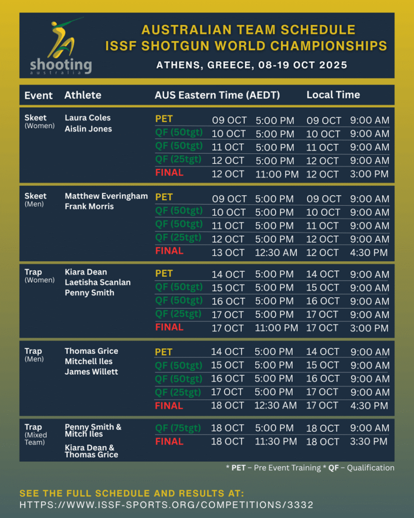 To keep up to date with all the action and follow the Australia shotgun team live, follow the Australian Team Competition schedule below.