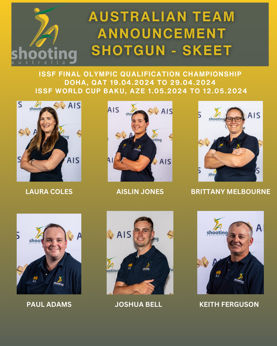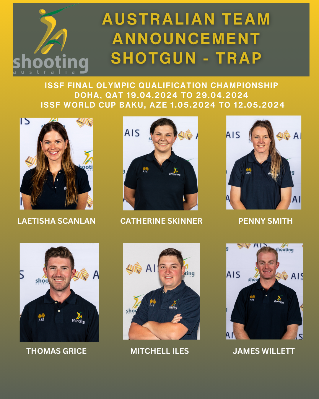 Following completion of the domestic component of the Olympic Nomination Criteria for Shotgun, the following Athletes will progress through to the international phase, and have been selected to the Australian Team for the ISSF Final Olympic Qualification Championship in Doha, Qatar and the ISSF World Cup in Baku, Azerbaijan.