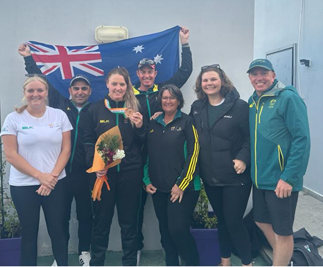 Smith (centre) with fellow Australian team members (Left to Right) Kiara Dean, Milad Nasr, James Willett, Deserie Baynes (support coach), Catherine Skinner and Richard Sammon (National Coach)